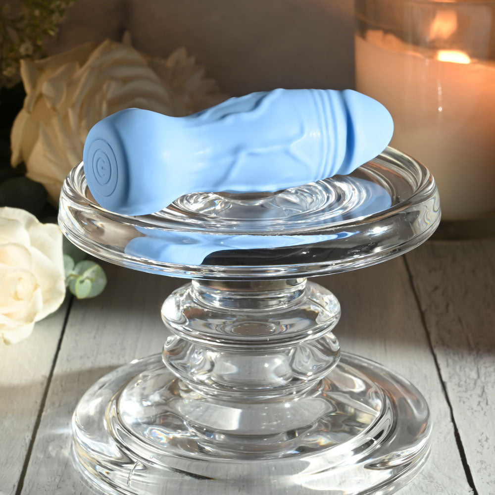 This pocket-sized silicone vibrator is crafted with life-like textures including a crown tip and realistic veins. Its hand-friendly design tapers to a chunky base with a 1-button control at the bottom that operates 11 vibrating speeds and patterns from mild to intense.